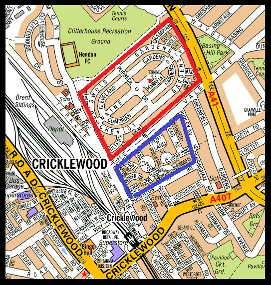 Map indicating the layout of the former Handley Page complex. The location of the factory buildings is marked in blue, the adjoining airfield in red. This area lies a short distance south of Brent Cross shopping centre. (A-Z imaging)