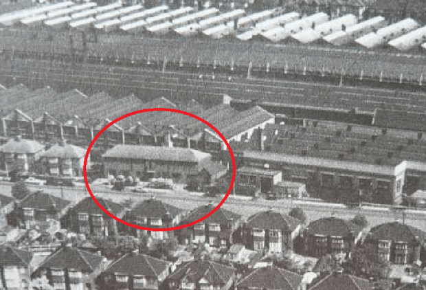 Aerial view of the Handley Page factory, Cricklewood. The one surviving building (pictured in the image above) is circled in red.