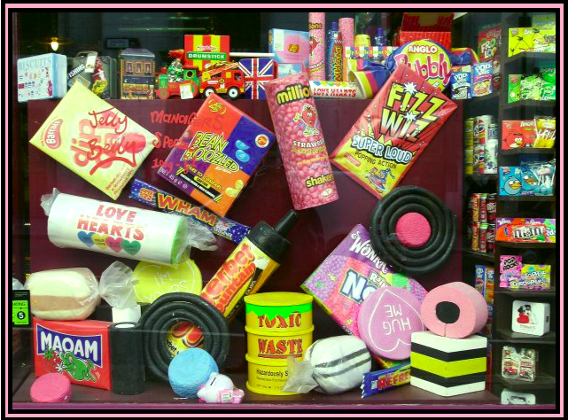 Giant models of sugary favorites adorn a sweet shop window on Ludgate Hill, November 2013.