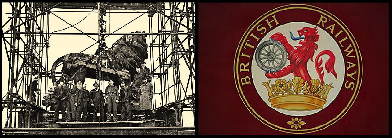 The Coade Stone Lion being removed from the brewery in 1949 (left) and the symbol for British Railways (right)
