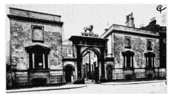 Holding pride of place above the brewery’s main entrance, the mighty lion was originally painted red as the mock-up image below illustrates…
