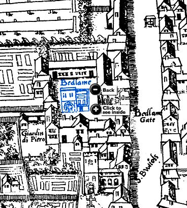 16th Century map (the ‘London Copperplate’) showing the location of Bedlam Hospital. The long, wide road to the right is the present day Bishopsgate; still a major route through the City (image from the Museum of London)