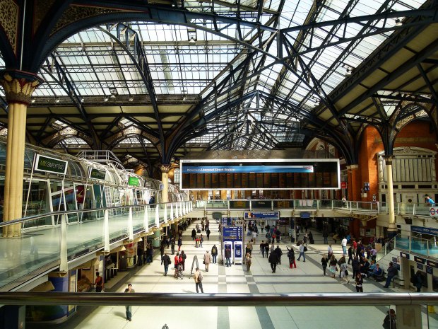 Liverpool Street’s two levels can be seen here- the balcony is at street height whilst the lower concourse, where trains arrive and depart, is below ground.