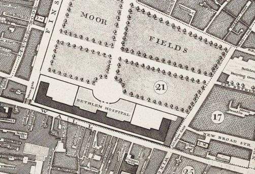Original map showing the location of the second Bedlam Hospital which was located where the present day Finsbury Circus now lies