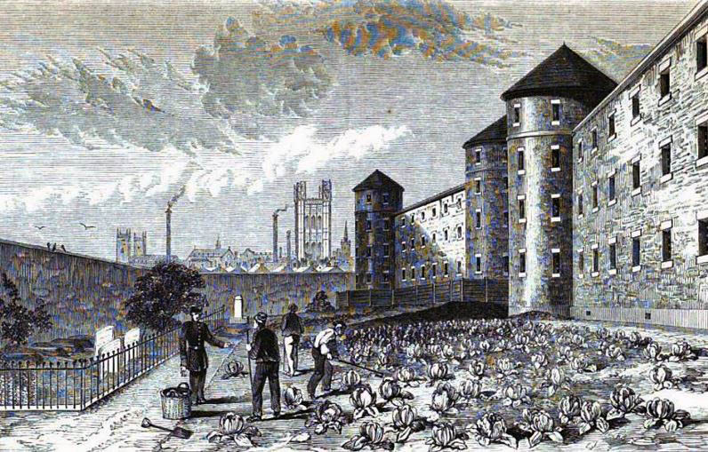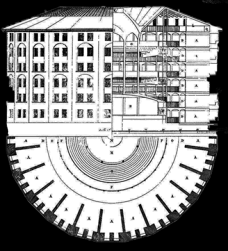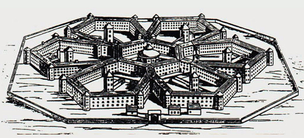 Believing prisoners should be held in a safe, clean- albeit tough- environment, Jeremy Bentham drew up plans for a new type of gaol- the Panopticon; a circular prison in which cells are arranged around a single watch tower.
