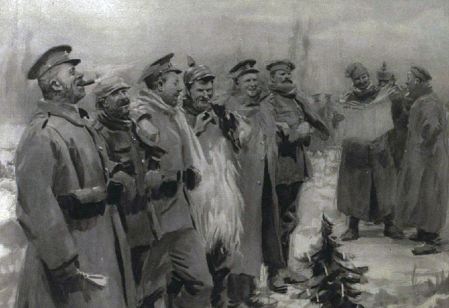 “On some sections of the battle-front the Germans decorated their trenches with Christmas-trees and paper lanterns, and invited our troops to stop shooting and come over to smoke and have a palaver. With one accord a truce for the night was arranged, and the compliments of the season were passed with much enthusiasm between friend and foe.