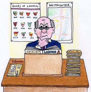 Each one contained a large, dark wooden desk behind which the examiner sat, emulating the sort of feeling you’d have if you were a badly behaved schoolchild, and had been sent before the Headmaster. The desks contained an upright board; a sort of book stand, upon which the examiner would often have a London map book perched.