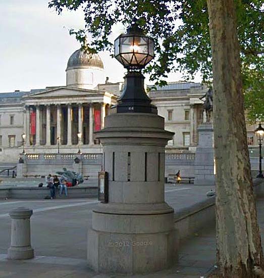 “Trafalgar Square, Sir- on the south-east corner.” (It’s a hollow pillar with a door and window, now mainly used as a broom cupboard, but there is still a police phone in there!)